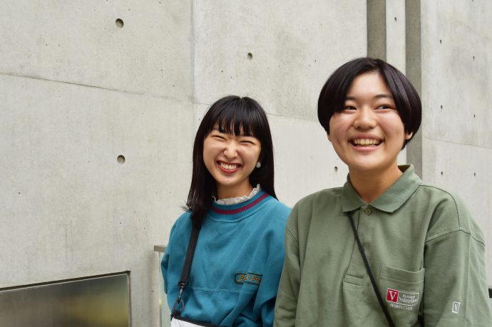 カルチャーやアート好きなムードを感じる2人は、どちらも元ウルフヘア。ひかりさん(右)はウルフを切ってマッシュに、もとえさん(左)は伸びたウルフの毛先を自分で切っているそうです。