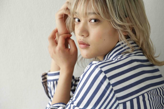 【colorrecipe】A(ブリーチ)/ホーユー プロフェッショナル「レセパウダーブリーチEX」+6%(2倍)B(オンカラー)/ルベル/タカラベルモント「エドル」Gr-15:Be-13=1:1+6%C(オンカラー)/ルベル/タカラベルモント「エドル」Gr-11:Be-9=3:1+4%【colorprocess】1.Aのブリーチで根元を1センチをあけて、毛先まで塗布。グラデーションになるように毛先はしっかり塗布する。15分放置し、その後、Aを根元ギリギリまで塗布し、30分放置。18レベルまでリフトアップしたら流す。2.ウエット状態で、根元を5センチあけ、毛先までBを塗布。塗布後、まだ塗布していない根元に間隔をあけずに、Cを塗布。20分放置。3.Cを、毛先に向かい3センチ程度コーミングでぼかす。5分放置後、流す。【仕上がり】