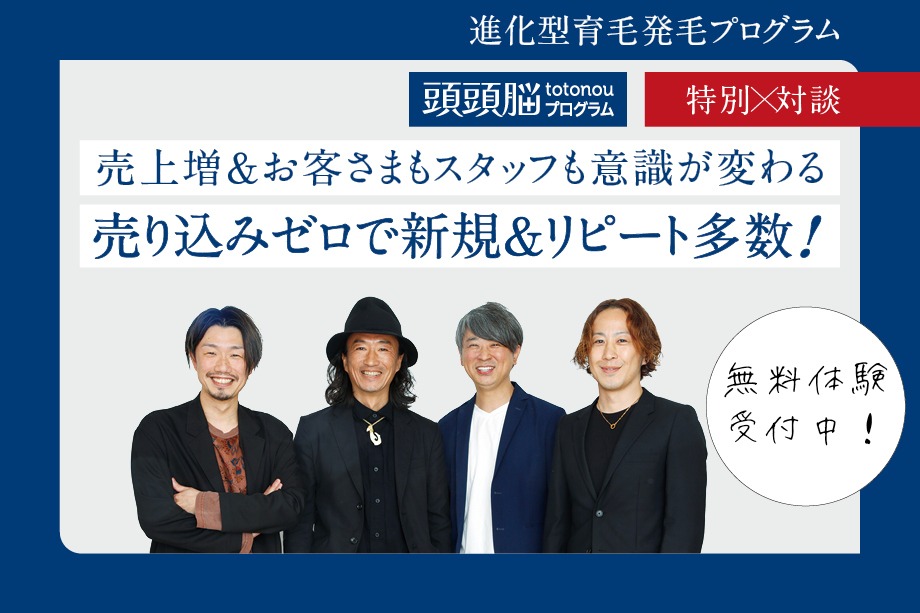 真空吸引で頭皮の老化脂を取り除いて有効成分を届け、さらにリラクゼーション効果も期待できる「頭頭脳プログラム」をいち早く導入した4サロンの経営者が、売上アップに加え、お客さまやスタッフの意識まで変えた驚きの効果を語り合った。