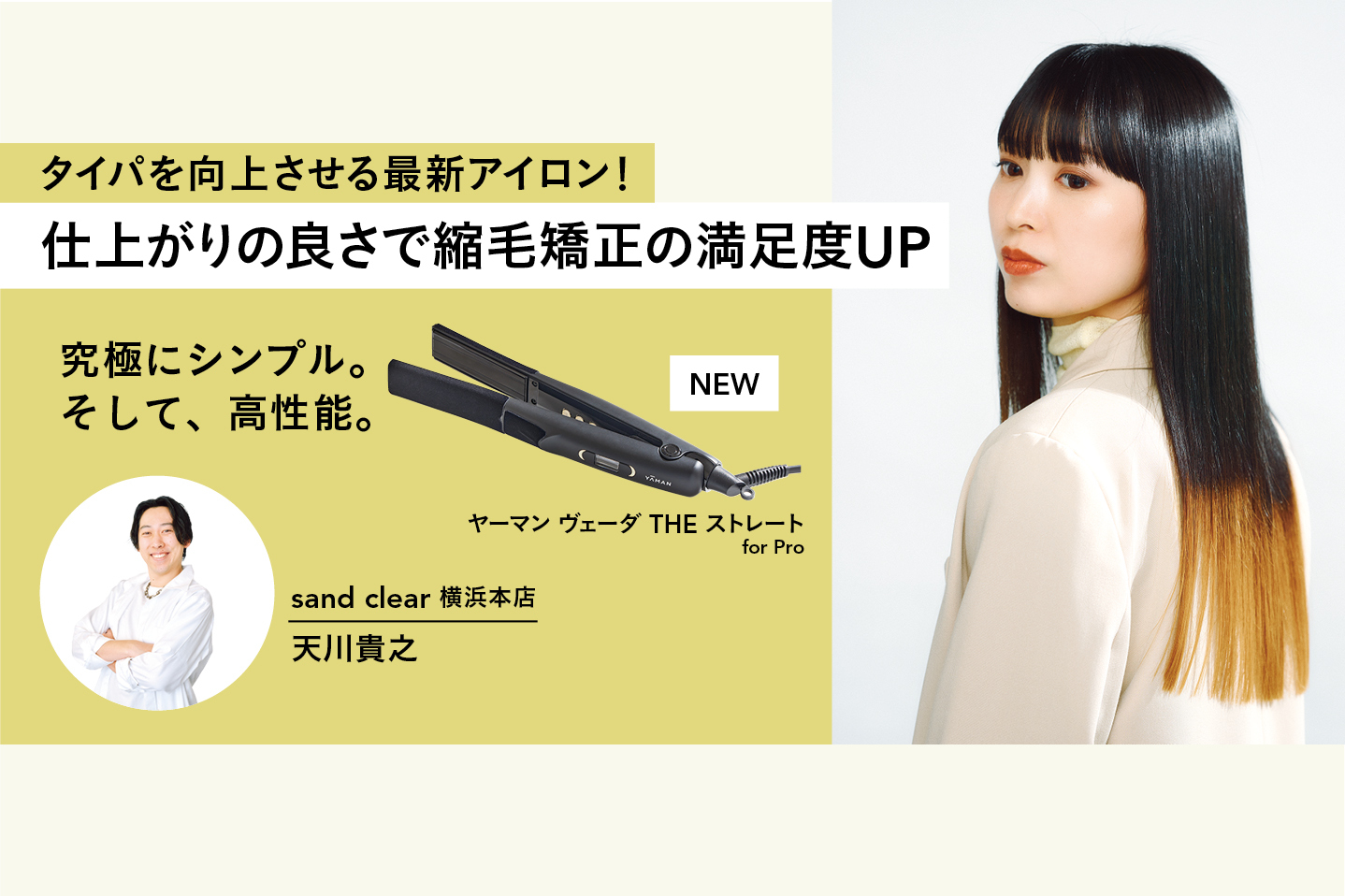 縮毛矯正で使用するストレートアイロンはパワーがありながらも髪への負担が少なく、さらに操作性が良いことが求められる。それらを全てかなえるヤーマンの最新アイロン『ヴェーダ THE ストレート for Pro』を、縮毛矯正のスペシャリストである天川さんに使用してもらい、同製品について紹介する。