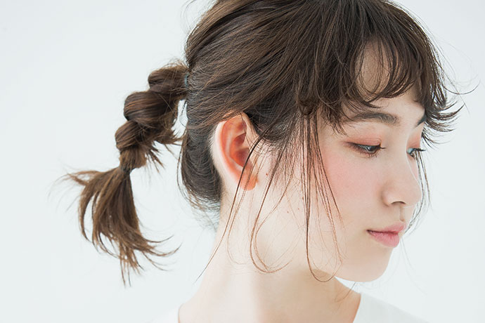 ▲ゆるくまとめたポニーテールを三つ編みにし、顔まわりのおくれ毛でやわらかなニュアンスをつける。ポイントメイクは淡いピンクで統一し、ソフトな雰囲気に仕上げた。目もとは明るいブラウンで春らしいイメージに。
