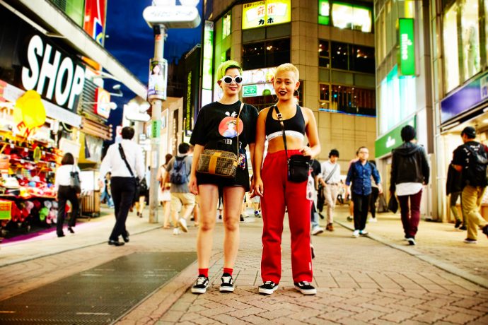 渋谷の中心地でもひときわ目立っていた2人、蛍光グリーンのショートヘアのめぐみるくさん(20歳)と、おしゃれボウズの吉乃さん(20歳)。加えて、パンチの効いた日本Tシャツやら、スポーティなブラトップやら……。かわいいのは、「偶然!」と言っていた2人でおそろのスニーカーです。